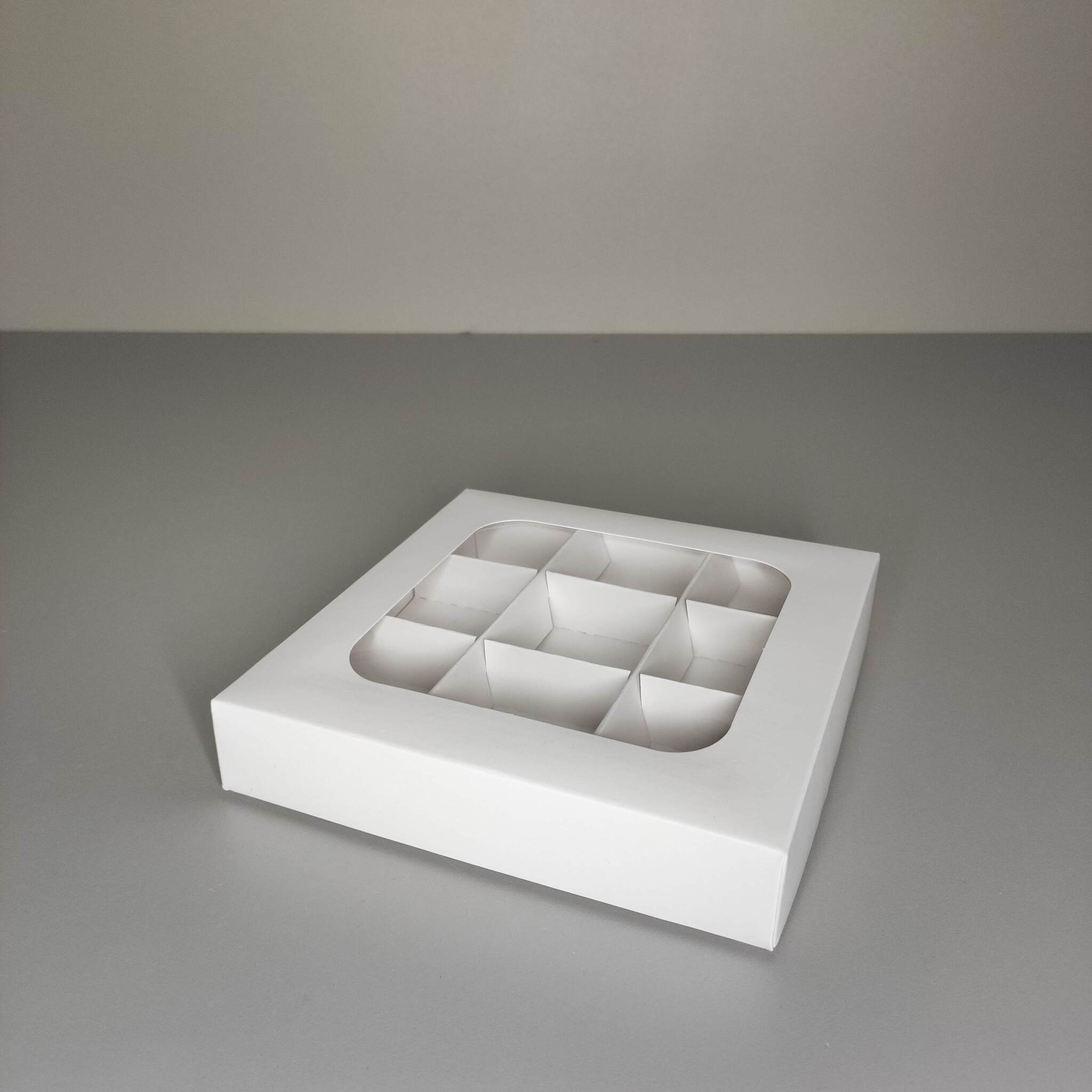 Коробка для конфет 9 шт с окном белая, ячейка 5х5см, 15х15х3 см
