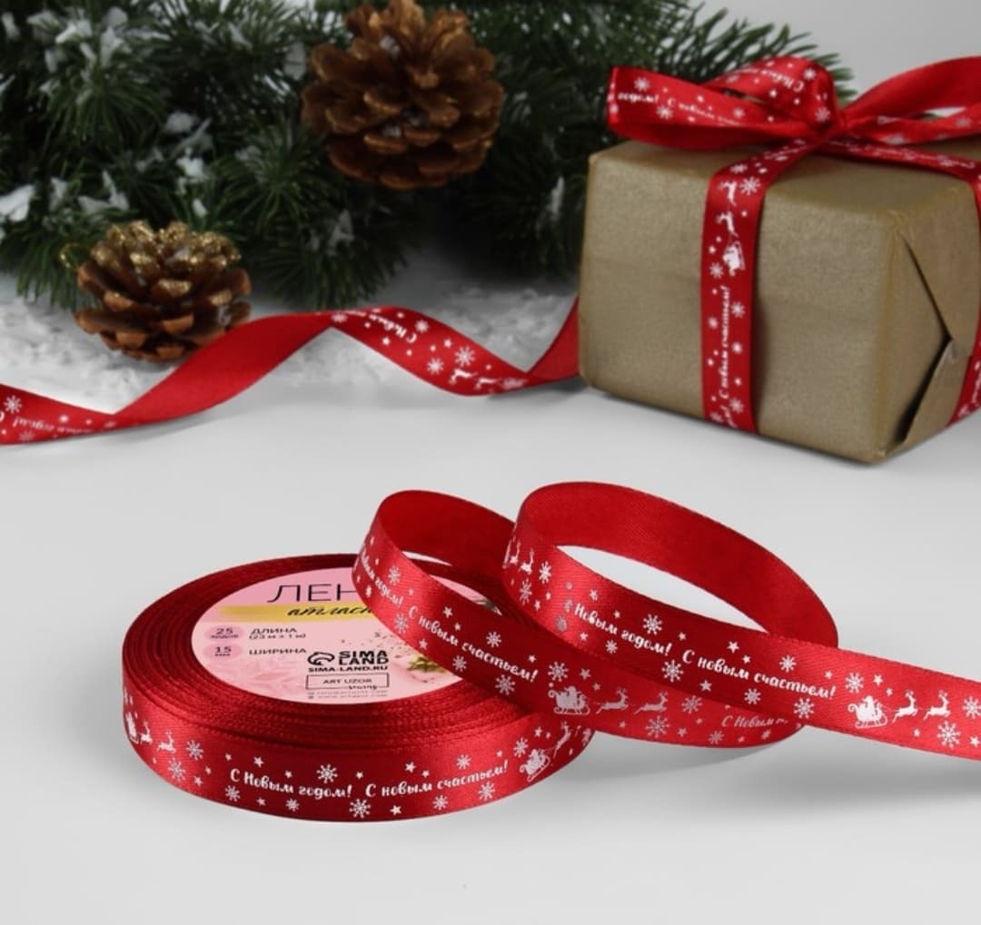 Лента атласная "С Новым годом" 15 мм 23 м красная
