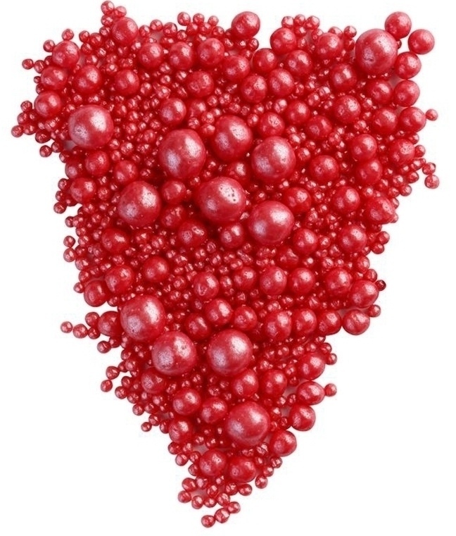 Посыпка воздушный рис в жемчужной глазури красного цвета. Легкие, хрустящие, легко крошатся при надавливании.
