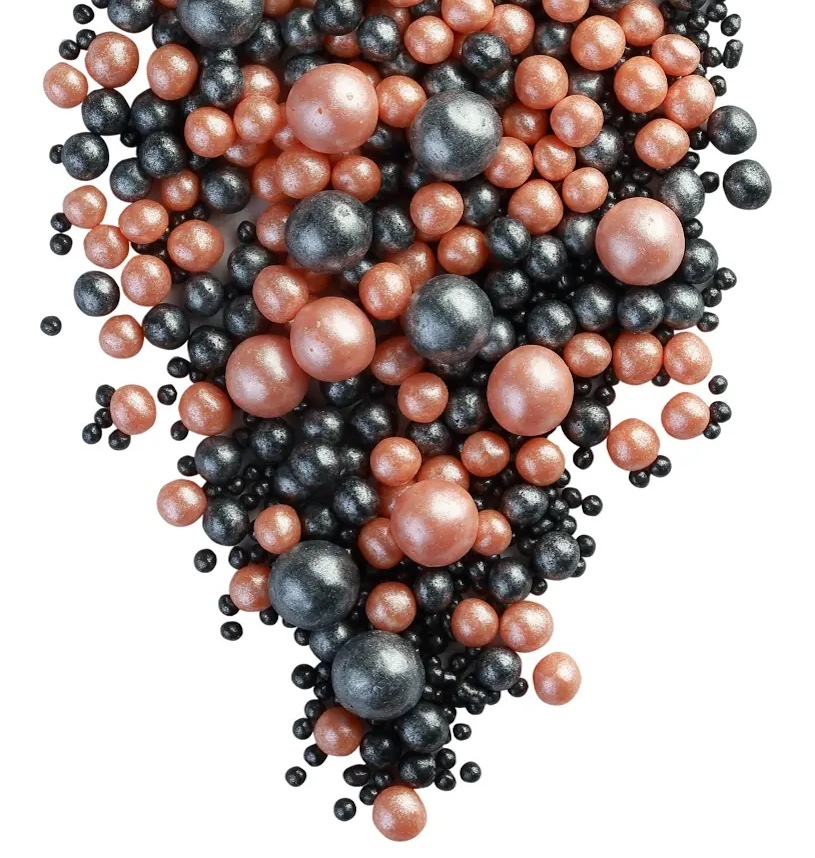 Посыпка воздушный рис в жемчужной глазури персикового и черного цвета. Легкие, хрустящие, легко крошатся при надавливании.