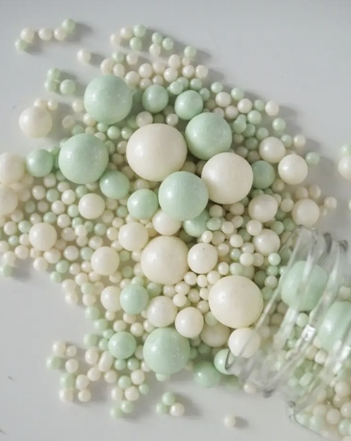 Посыпка воздушный рис в жемчужной глазури. Легкие, хрустящие, легко крошатся при надавливании.