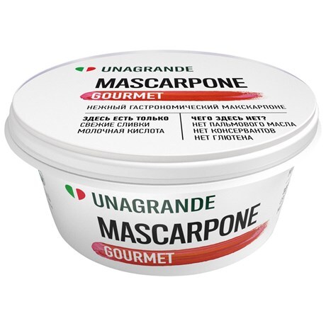 Сыр "Маскарпоне" Unagrande 80% - нежнейший, изготовленный из свежих сливок. Состав: сливки пастеризованные, регулятор кислотности - молочная кислота.