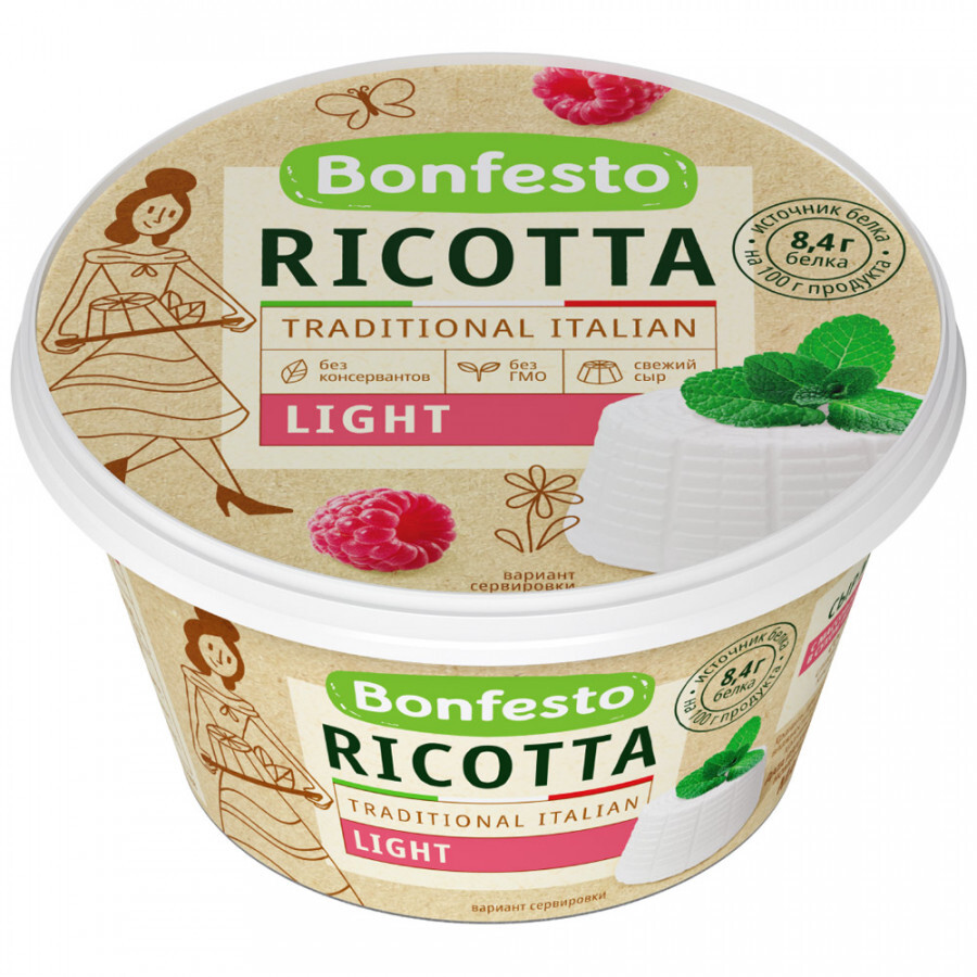 Ricotta Light Bonfesto – разновидность сыра из сыворотки. Если классическая рикотта имеет жирность в сухом веществе 50%, то Ricotta Light – сыр, который имеет жирность в сухом веществе 40%. Она содержит меньше калорий, а соответственно призван стать полезной частью рациона тех, кто стремится быть в форме, уделяет большое внимание составу продуктов, оптимально сочетая пользу для организма и энергетическую ценность. Такой сыр идеально подходит для приготовления десертов.