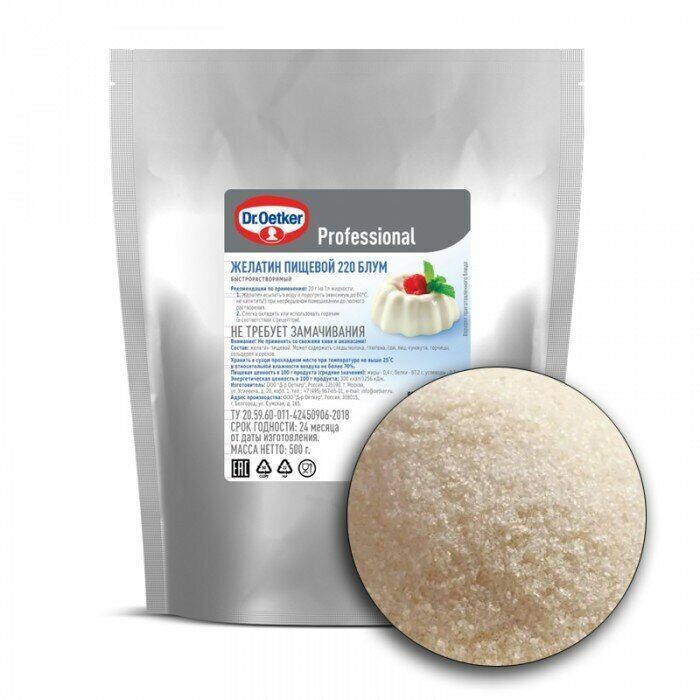 Желатин быстрорастворимый говяжий 220 bloom Dr.Oetker - натуральное высококачественное желирующее средство. Идеально подходит для приготовления широкого ассортимента современных и классических десертов, например, желе, суфле и муссов